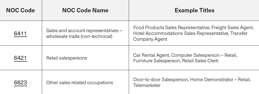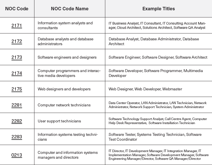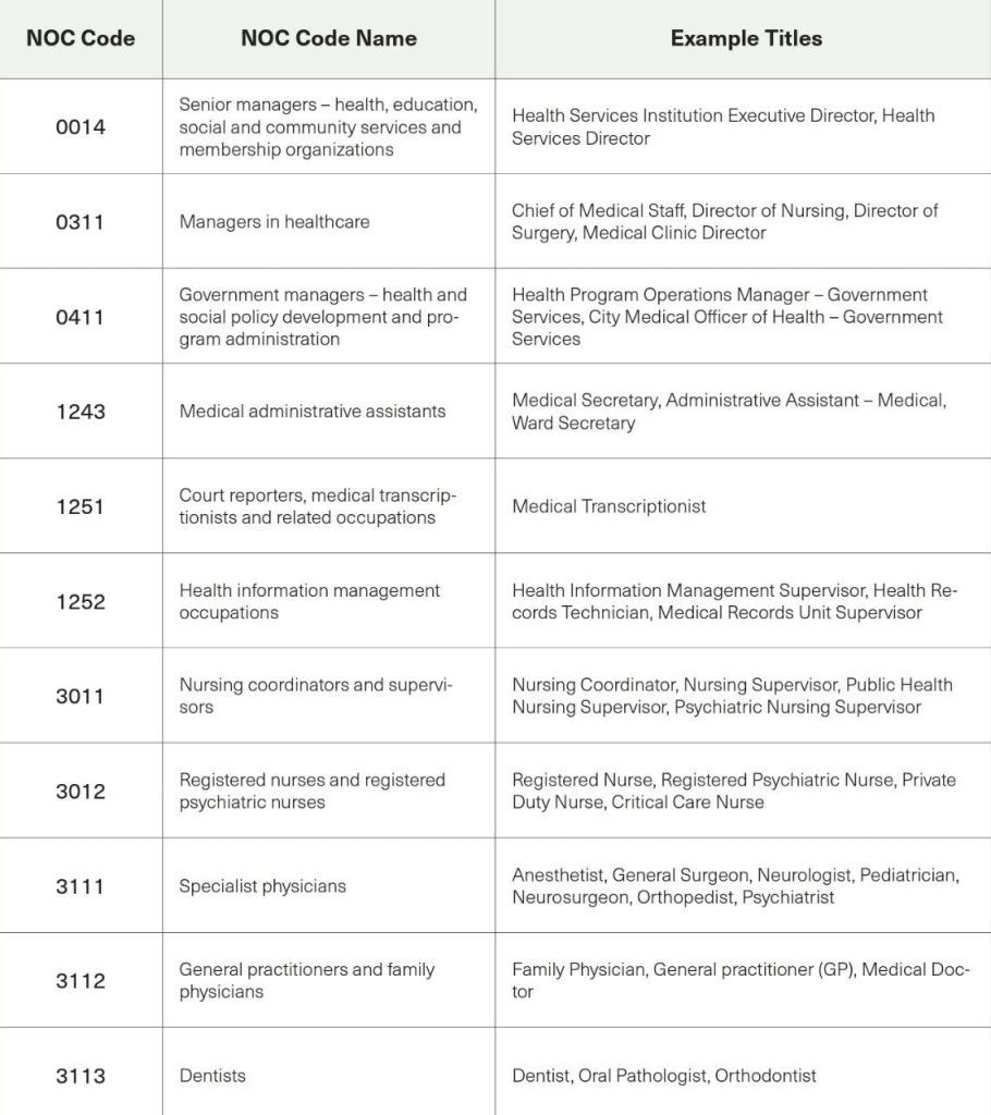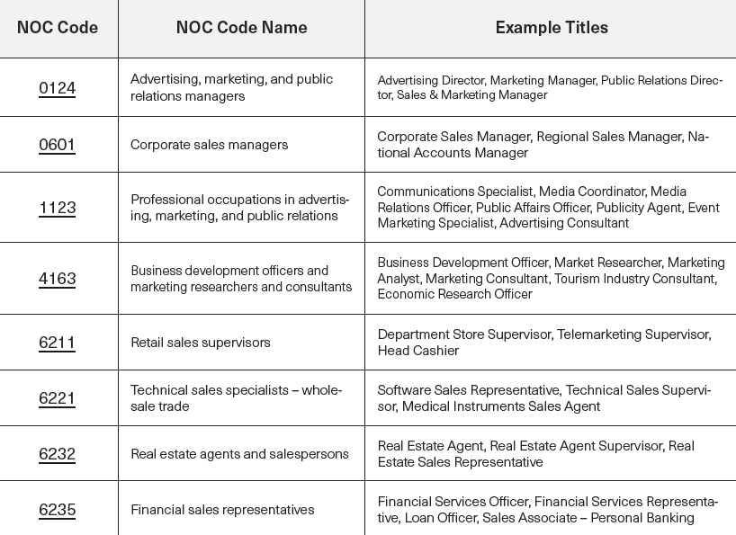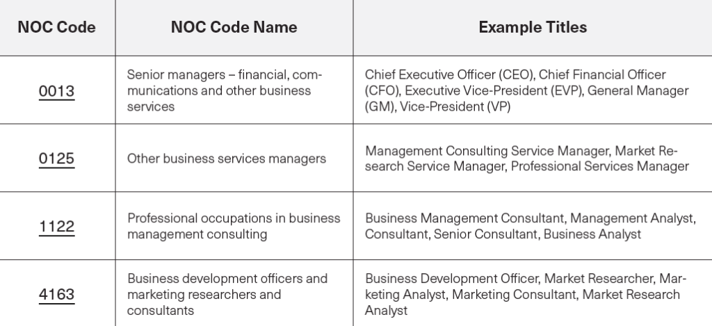 Please be aware that the provided list of codes and titles is not comprehensive and serves as a reference. If you cannot locate your specific industry, sector, occupation, or job title here, kindly visit the NOC website for a broader selection of codes and titles that may more accurately correspond to your background and profession.